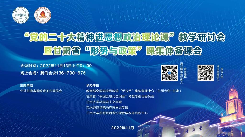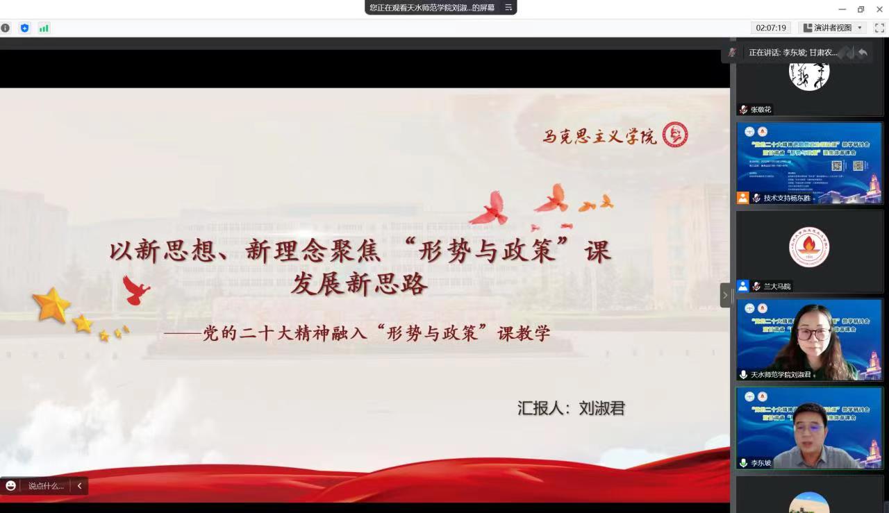 近日,马克思主义学院全体思政课教师参加由中共甘肃省委教育工作委员会主办,教育部全国高校思政课“手拉手”集体备课中心(兰州大学—甘肃)、甘肃省“形势与政策”分教学指导委员会、甘肃省“中国近现代史纲要”分教学指导委员会、兰州大学马克思主义学院、我校马克思主义学院、兰州大学思想政治理论课教学改革创新中心共同承办的“党的二十大精神进思想政治理论课”教学研讨会暨甘肃省“形势与政策”课集体备课会,此次备课会通过线上举行。会议由教育部高等学校思政课教学指导委员会委员、教育部全国高校思政课“手拉手”集体备课中心(兰州大学—甘肃)负责人、兰州大学教授张新平主持。我校全体思政课教师参加此次集体备课会。