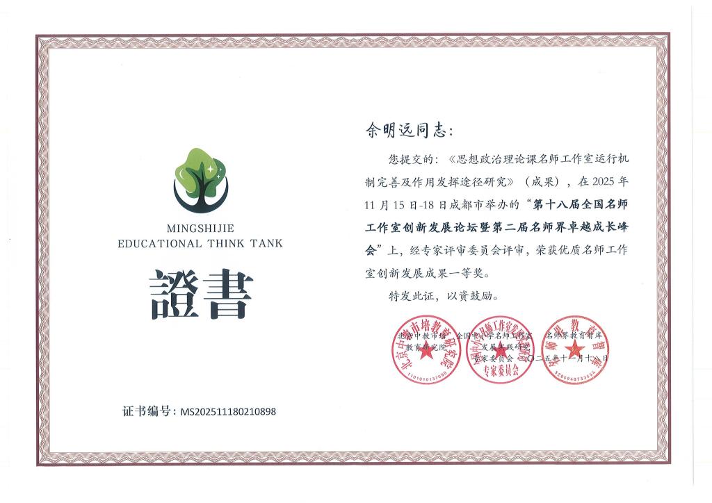 甘肃省思想政治理论课余明远名师工作室主持人余明远教授应邀参会并作了题为“新时代思政课名师工作室运行机制及作用发挥途径研究”的主旨发言,其研究成果获得名师工作室创新发展成果一等奖。