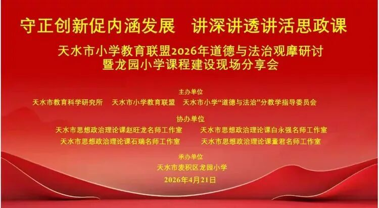 为深入学习贯彻习近平总书记关于学校思政课建设的重要指示精神,全面落实立德树人根本任务,推动大中小学思政课一体化建设,提升我市小学道德与法治教育教学质量,2026年4月21日,天水市小学教育联盟2026年道德与法治观摩研讨暨龙园小学课程建设现场分享会在麦积区龙园小学成功举办。本次活动采取了线上+线下的形式开展,利用龙园小学公众号直播,全市小学教育联盟41所学校参与活动。
